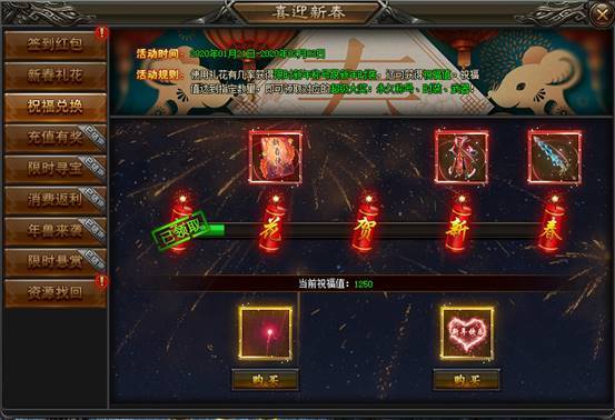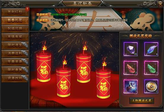 规则:使用普通礼花跟超级礼花可获得祝福值,祝福值达到一定数量时,可领取对应奖励。