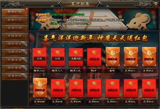 规则:每天登录,即可免费领取一个新年红包,还可花费钻石额外领取一个。