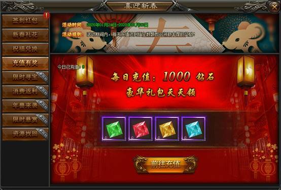 充值8000钻石:新春使者称号卡*1, 5级生命宝石*1, 5级攻击宝石*1,5级防御宝石*1,5级韧性宝石*1。
