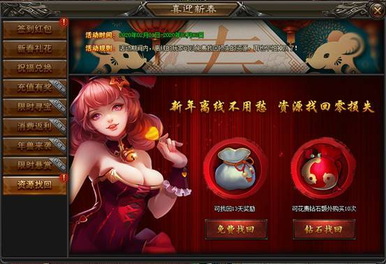 规则:春节期间没有登录的玩家,可找回相应的资源。除了免费找回资源,还可以花费钻石找回额外的资源。