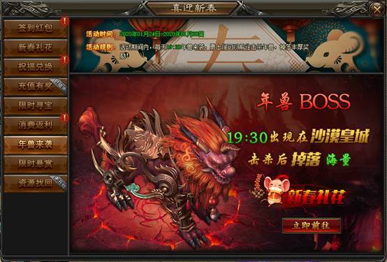 规则:每天19:30在沙漠皇城刷新年兽BOSS,击杀年兽BOSS可获得大量礼花、妖躯炼化丹、炼化突破丹。