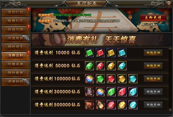 消费300000钻石:永久新春使者时装(女)*1,宝石精髓*3,7级生命宝石*1, 7级攻击宝石*1,7级韧性宝石*1。