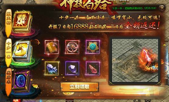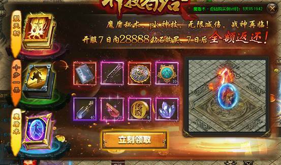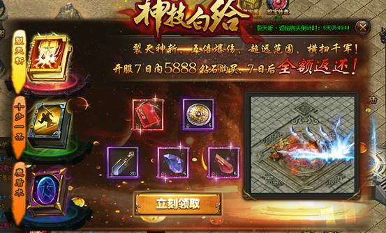 活动介绍:开服前7天购买神技,7天后钻石全返,可领取大量奖励