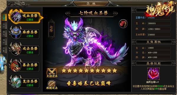 游戏中有五只圣兽,做主线任务即可开启,只需消耗元宝即可将圣兽升级。每只圣兽都有自己非常强大的技能,分别有麻痹BOSS、治疗主角、攻击、暴击、复活主角的技能。另外,游戏首创将五只圣兽合体的惊喜玩法,合体圣兽将有神秘且强大的技能等待玩家探索。