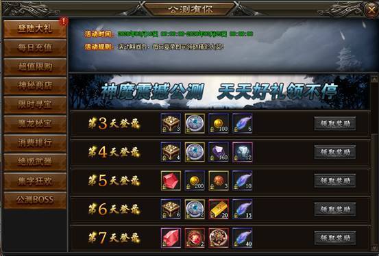自今日起,十重公测福利活动劲爆上线。登录天天领好礼,每天都有新惊喜;寻宝神之宝藏,众神装备概率限时翻倍;公测绝版武器称号,戮神屠魔,震撼全场;击杀怪物,狂欢集字,兑换丰厚奖励;公测BOSS限时击杀,称霸沙漠皇城……公测狂欢,诸多福利相送,让你的升级之路一马平川!